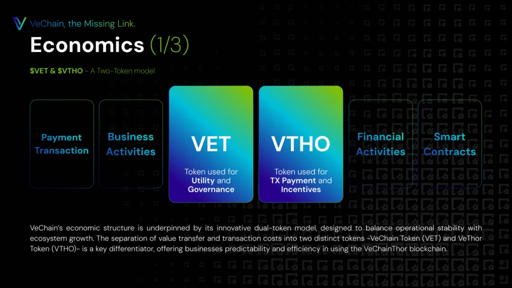 VeChain’s economic structure is underpinned by its innovative dual-token model, designed to balance operational stability with ecosystem growth. The separation of value transfer and transaction costs into two distinct tokens -VeChain Token (VET) and VeThor Token (VTHO)- is a key differentiator, offering businesses predictability and efficiency in using the VeChainThor blockchain.